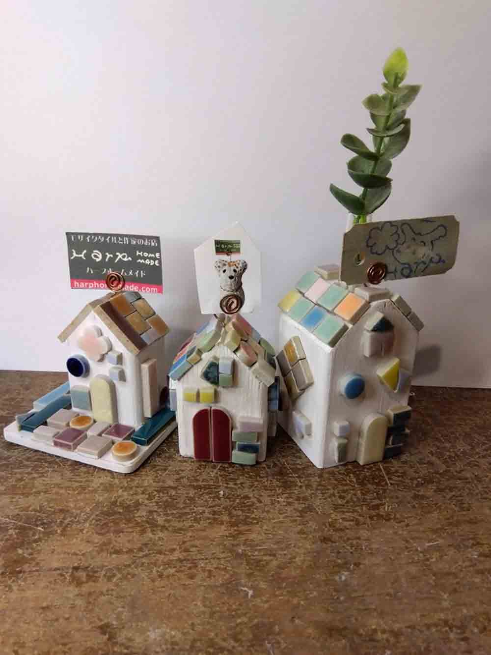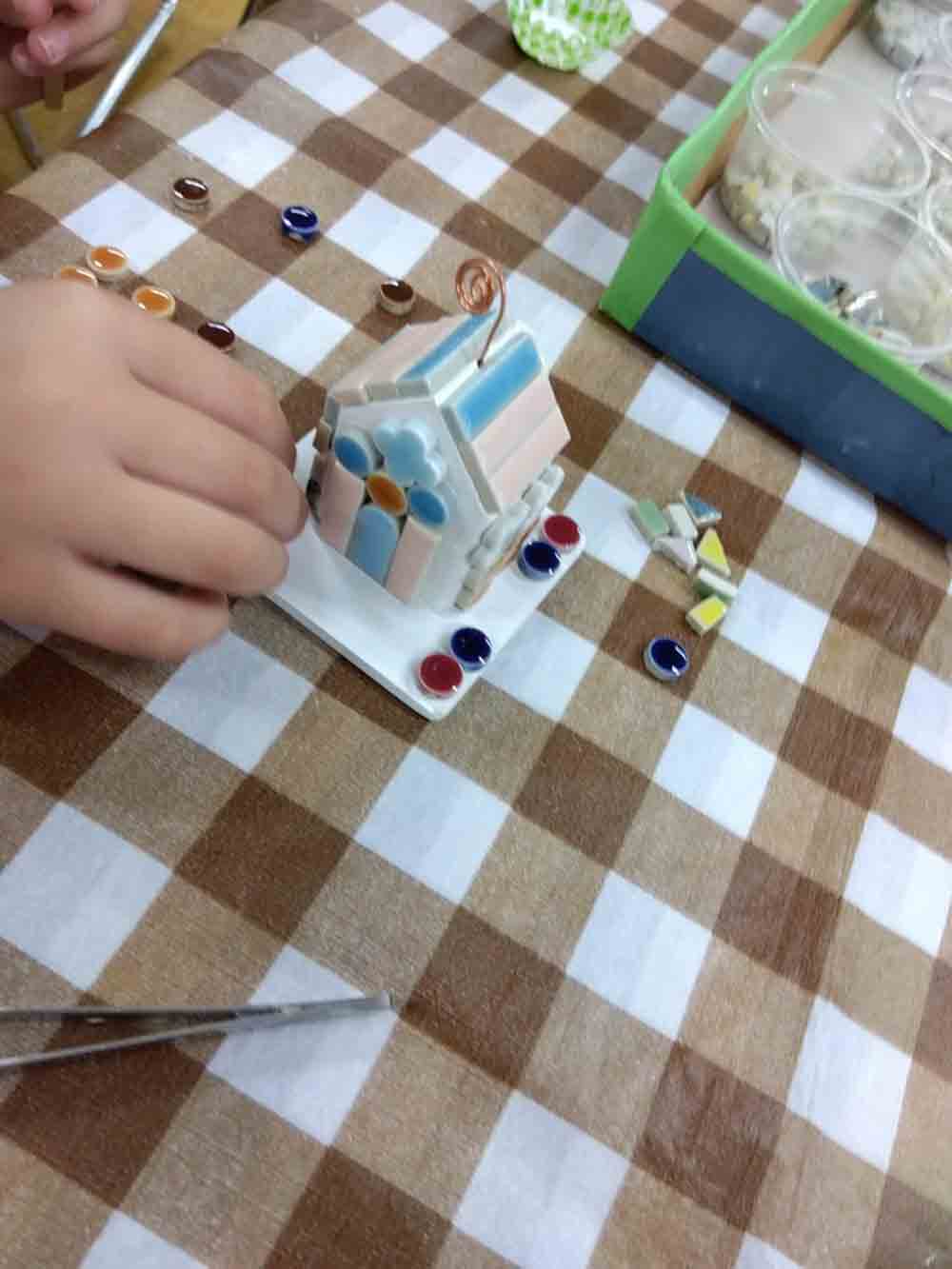 いろいろな色やかたちのモザイクタイルで立体のお家を作ります。(当店のオリジナルベースのお家)